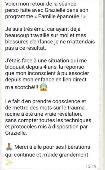 Un accompagnement sur plusieurs séances, durant lesquelles nous avançons ensemble vers une vraie transformation, une libération de tes schémas répétitifs et la reprogrammation de ton système nerveux afin d'accéder avec légèreté à cette vie plus sereine à laquelle tu aspires avec ta famille.